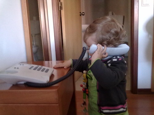 Chegamos ao Hotel eu fui correr logo para o telefone que estava lá , adoro falar mas os papás tiraram me para eu não estragar.